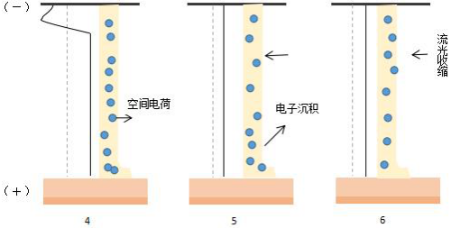 午夜电影网站机工作时,电子相对于离子具有较强的可流动性,使其在可测量的纳秒级范围内穿过气体间隙。当电子雪崩在气体间隙形成并产生定向移动时,离子由于运动速度慢而被滞留在后面逐渐在放电空间形成积累。空间电荷的产生最终使午夜电影网站机的放电空间的电场产生畸变,从而使电极间空气间隙的电场强度等于或超过周围气体的击穿场强,使得在较短的时间内气体电离急剧增加,最终导致单个丝状放电的发生。