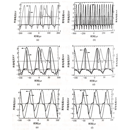 伴随着施加的电压慢慢变大,电极间会形成放电,经过调节电压可以得到不同形态的放电电压与电流曲线。在仅变化外加电压幅值的情况下,其外加电压与放电电流的关系如图(a)~图(f)图示。